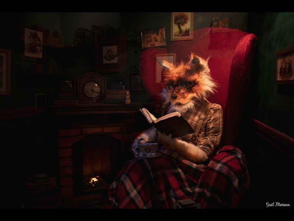 Le projet a pris la forme d’un diorama animé, entièrement réalisé à la main, qui recrée l’intimité de la librairie d’Archibald Renard, le personnage principal. Nichée au creux d’un arbre, la scène présente un fauteuil, une cheminée et une bibliothèque regorgeant de livres miniatures. Au centre, une marionnette du renard s’anime de manière autonome, créant l’illusion qu’il est sur le point de lire ou de s’assoupir.